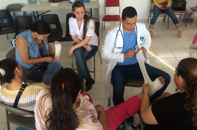 Yesterday was an important day for our Promotores. They learned all different kinds of bandaging and stabilization. Sometimes they practices on the brigade members and sometimes on each other. They also received intensive instruction in nutrition from the nutritionists who are also part of our team.